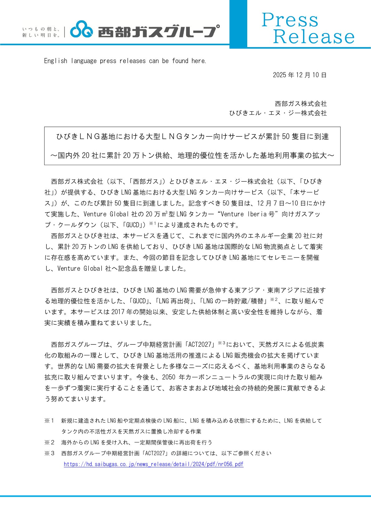 ひびきLNG基地における大型LNGタンカー向けサービスが累計50隻目に到達 ~国内外20社に累計20万トン供給、地理的優位性を活かした基地利用事業の拡大~